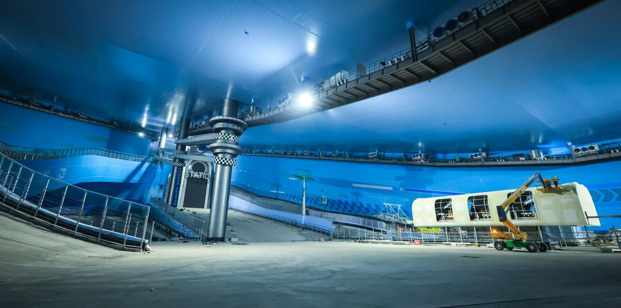 盡管室內(nèi)滑雪場仍在施工中,但嶄新的雪具大廳已經(jīng)進(jìn)入裝修的最后階段,分布在墻上和頂棚的藍(lán)色光帶營造的雪花造型,給人以強(qiáng)烈的視覺沖擊。進(jìn)入到滑雪場內(nèi)部,四條不同等級的雪道顯露真容,拖掛式纜車的核心設(shè)備已安裝到位,空中纜線基本鋪設(shè)完成。