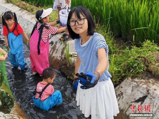 8月11日,2025年吉林省臺聯(lián)第五屆兩岸婚姻家庭親子夏令營走進(jìn)吉林市,營員們在稻田體驗(yàn)抓螃蟹!↑S子珊 攝