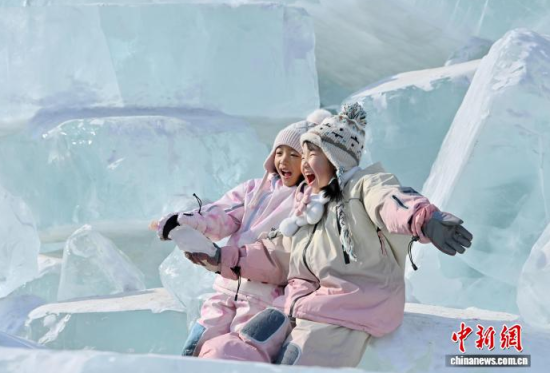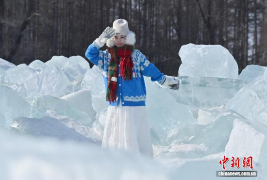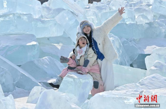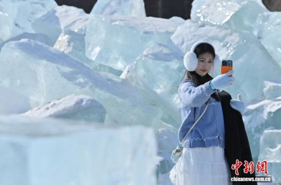 2月9日,在長(zhǎng)春凈月潭國家森林公園內(nèi),由水庫天然冰塊堆砌而成的“藍(lán)冰”景觀,吸引市民打卡拍照!八{(lán)冰”是指致密堅(jiān)硬的冰,因冰內(nèi)部空氣被擠掉而變得晶瑩透徹,這時(shí)陽光中波長(zhǎng)較短的藍(lán)光被致密堅(jiān)厚的冰層散射,冰塊便呈現(xiàn)出水晶般美麗的藍(lán)色。中新社記者 張瑤 攝