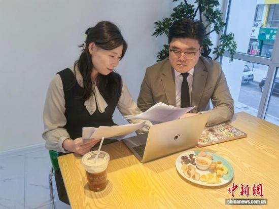 鄭鐘弼(右一)和愛(ài)人探討工作。石洪宇 攝