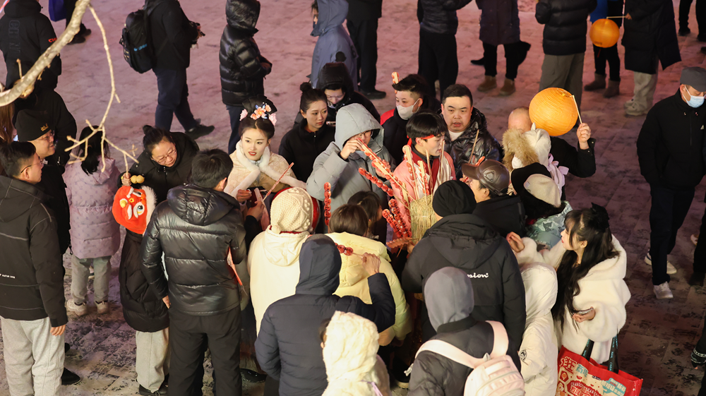 市民陳桂英是第三次走進(jìn)這片街區(qū)。74歲的她挎著相機(jī),拍下了舞龍隊(duì)伍、漢服巡游、冰雕糖葫蘆,也拍下了四海茶社門前被雪花浸白的樹枝,和游人歡樂說笑的身影。
